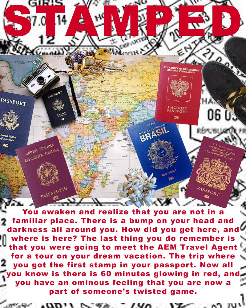 You awaken and realize that you are not in a familiar place. There is a bump on your head and darkness all around you. How did you get here, and where is here? The last thing you do remember is that you were going to meet the AEM Travel Agent for a tour on your dream vacation. The trip where you got the first stamp in your passport. Now all you know is there is 60 minutes glowing red, and you have an ominous feeling that you are now a part of someone's twisted game.