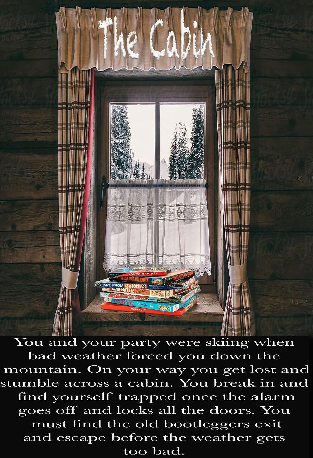 Welcome to The Cabin. You and your friends were out skiing when bad weather forced you off the mountain. On your way down you get lost and stumble across a cabin. you break in and find yourself trapped after tripping the alarm and all the doors LOCK! You must find the old bootleggers exit and escape before the weather gets too bad.
